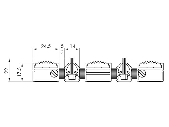 Bracket profile - aluminium - alloy 6060T6 Cleaning contribution: anti-slip rubber (7 teeth) - PVC – 72Sha Nylon scraping brush - bylon 0,4mm „fi 2” wire rope Distance bushes: width 3mm, 5mm of hardness 75Sh Nickel plated terminal keys, acoustic tape (bottom of the profiles) |
