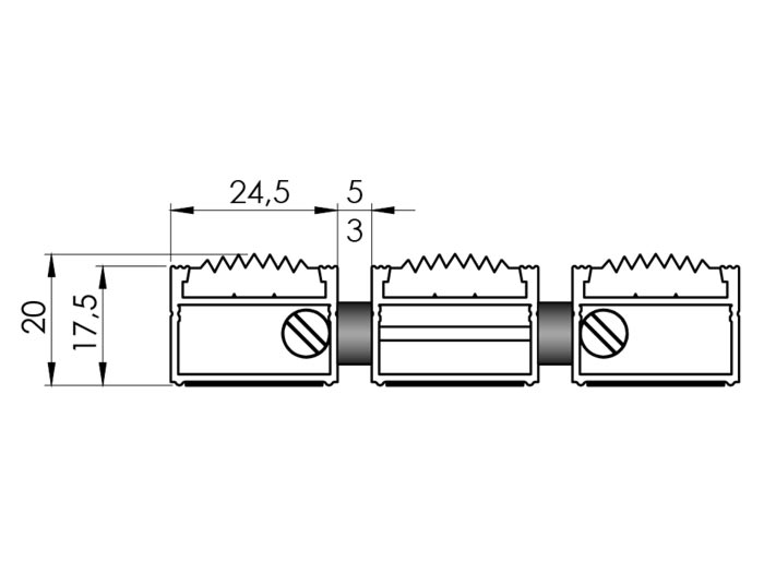 Bracket profile - aluminium - alloy 6060T6 Cleaning contribution: anti-slip rubber (7 teeth) - PVC - 72Sha „fi 2” wire rope Distance bushes: width 3mm, 5mm of hardness 75Sh Nickel plated terminal keys, Acoustic tape (bottom of the profiles) |